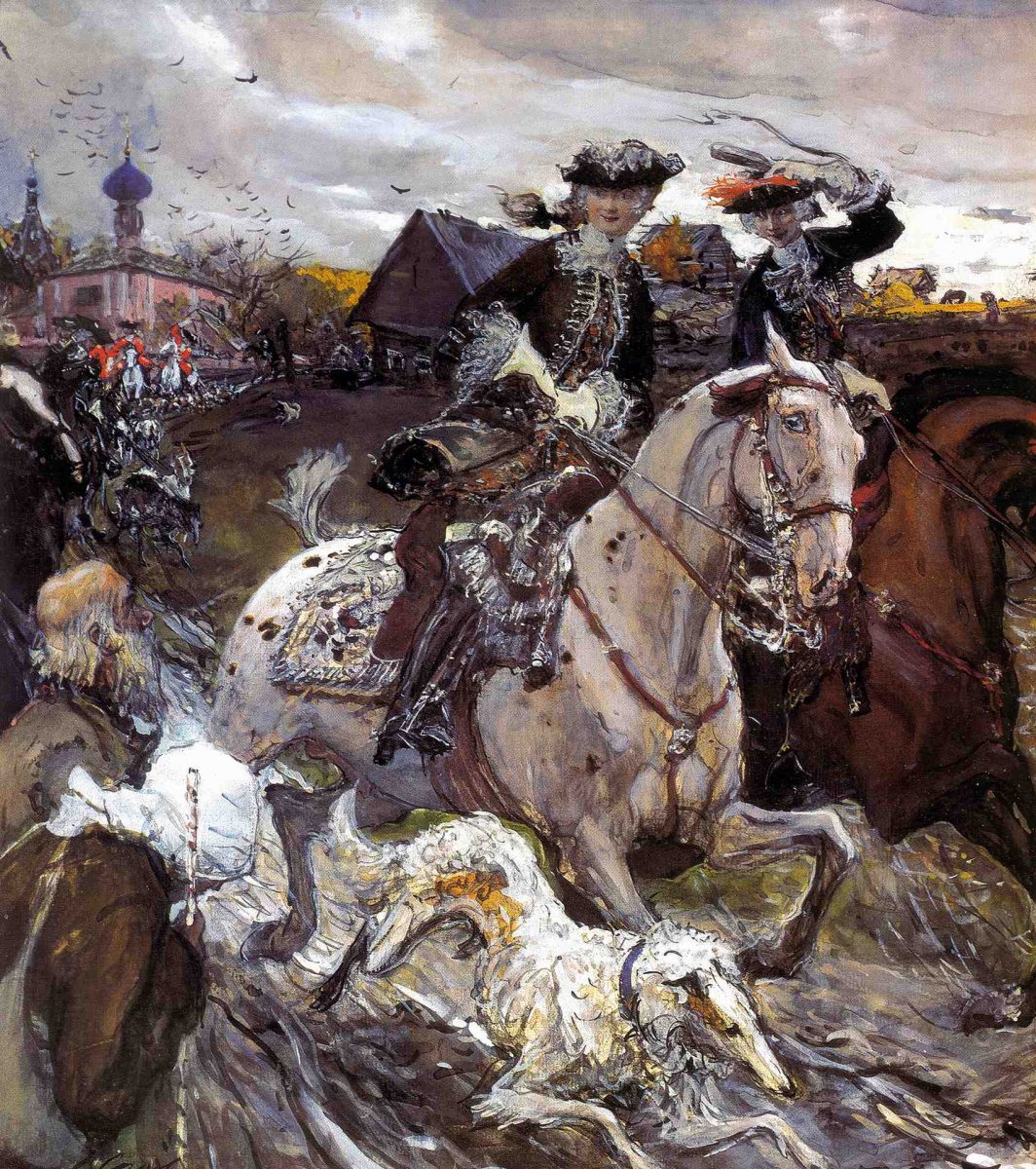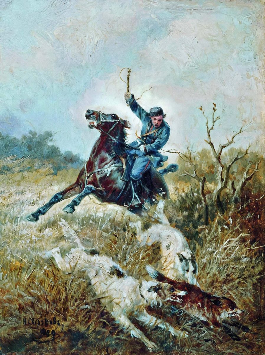 Classical Russian sighthound hunting has always been a cultural phenomenon of estate life. So many rules and rituals developed around it that the catch itself became secondary — the main focus was the spectacle, almost theatrical in nature. The hunting attire of the aristocracy alone — especially women’s — was something to behold. To ride in a sidesaddle, women wore specially tailored “amazone” dresses: with the saddle featuring two pommels and a single stirrup on the left, they sat sideways, which meant the skirt had to be asymmetrical! Field conditions — yet everything was velvet, satin, white lace cuffs, and veils. Specially trained horses and entire packs of dogs were kept for the hunt. Hounds in the pack were selected not only for their working abilities but also for their voices — the resulting “choir” was a source of great pride for the owner. A specialized vocabulary even emerged — linguists have identified at least 500 terms in the traditional Russian hunting lexicon. For example, different animals had their own unique word for “tail”: a hound’s tail was called a “gon” (literally “run”), a sighthound’s — a “pravilo” (meaning “straight edge”), a pointer’s — a “prut” (“rod”) or “pero” (“feather”), a wolf’s — a “poleno” (“log”), a fox’s — a “truba” (“pipe”), and a hare’s — a “tsvetok” (“flower”) or “pykh” (an onomatopoeic word suggesting a puff or fluff of movement).