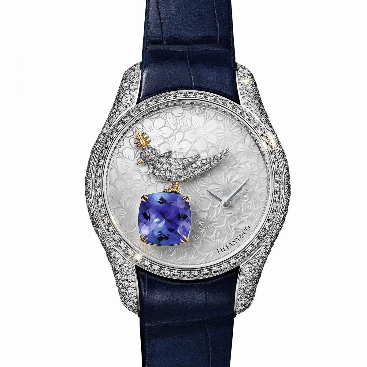 Tiffany & Co. once again reinterpreted the iconic 1965 brooch by Jean Schlumberger, one of the greatest jewelry designers of all time. Today, his delicate bird has flown onto the dial of the elegant ladies’ watch Bird on a Rock Legacy Tanzanite, at the center of which rests a 2.72-carat cushion-cut tanzanite. Even the prongs holding the stone resemble bird’s claws. The 36 mm case is decorated with diamonds in the intricate snow-setting technique, which takes artisans about 55 hours of work. Inlaying the golden bird with 119 diamonds and a pink sapphire requires more than a full day. A magnifying window on the caseback allows a glimpse of the stone’s hidden beauty.