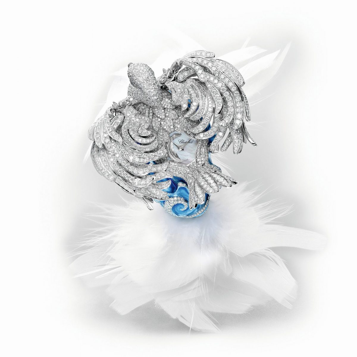 The House of Chopard showcased impeccable craftsmanship by adding to its miniature “bestiary” with the secret Swan Lake timepiece. This unique creation is the result of more than 1,500 hours of research, development, and handcrafting. The masterpiece, made from “ethical” white and yellow gold along with titanium, is set with a scattering of gemstones totaling 35.09 carats. When the swan’s head is moved into the central position, a true mechanical performance begins: the wings, made of three movable sections, gradually spread open to reveal a tiny mother-of-pearl dial. The watch is fastened to the wrist with a satin strap adorned with white feathers and secured by a feather-shaped buckle.